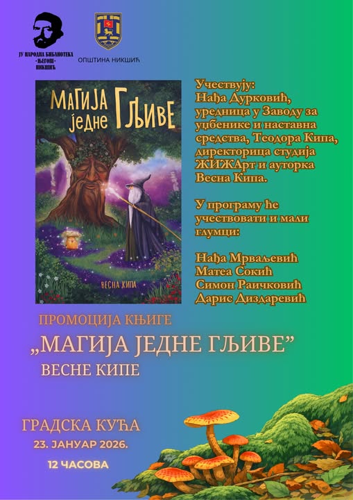 Danas je u Gradskoj kući održana promocija dječije knjige „Magija jedne gljive” autorke Vesne Kipe. Na događaju su, pored autorke, učestvovale Nađa Durković, urednica u Zavodu za udžbenike i nastavna sredstva Podgorica, kao i Teodora Kipa, direktorica studija...