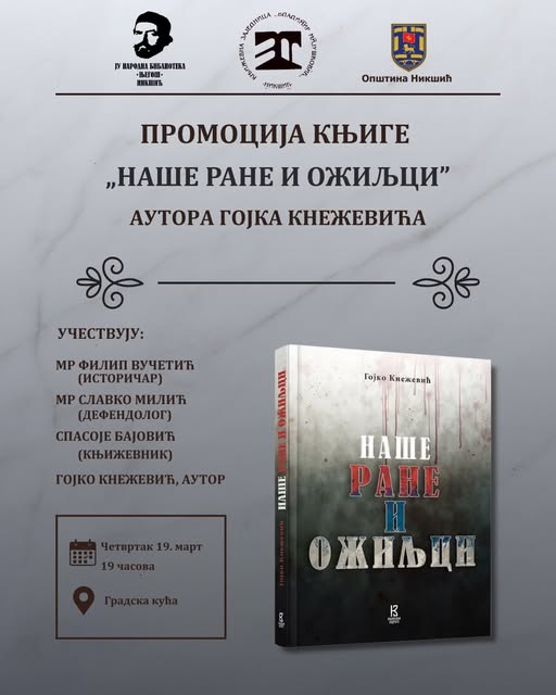 Синоћ је у свечаној сали Градске куће, у организацији ЈУ Народна библиотека „Његош“ Никшић, Општине Никшић, и КЗ „Владимир Мијушковић“, одржана промоција књиге „Наше ране и ожиљци“ аутора Гојка Кнежевића. О књизи су говорили: мр Филип Вучетић, историчар, мр Славко...